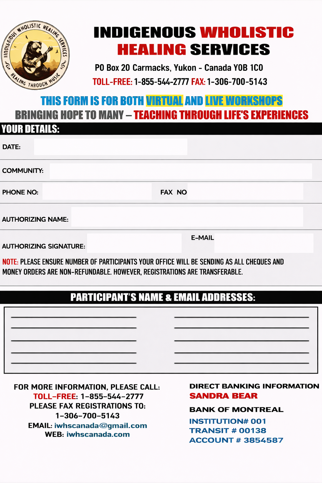 TOLL- FREE: 1-855- 544-2777 Cell: 306-580-9445 call/text Andrew Bear PO Box 20 Carmacks, Yukon - Canada Y0B 1C0